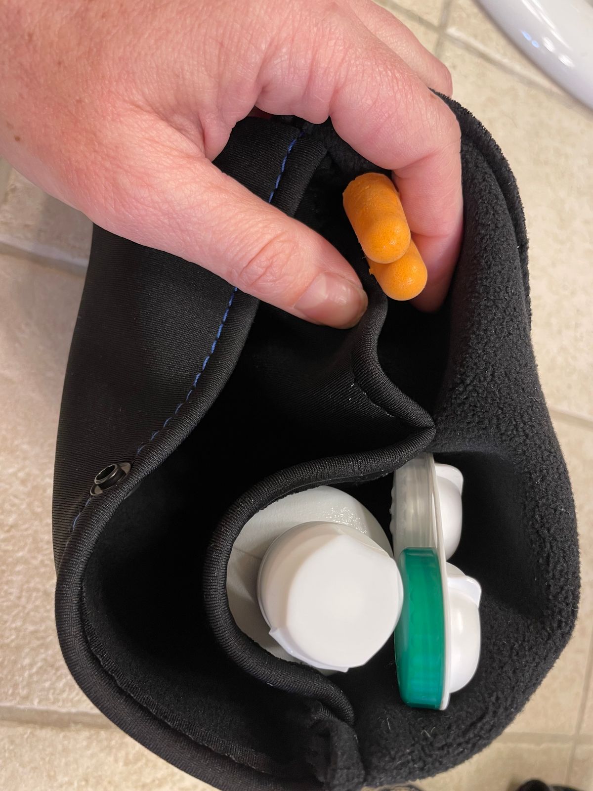 The mask comes with a travel case that makes it easy to clip to your bag and store essentials like earplugs, headphones, etc.